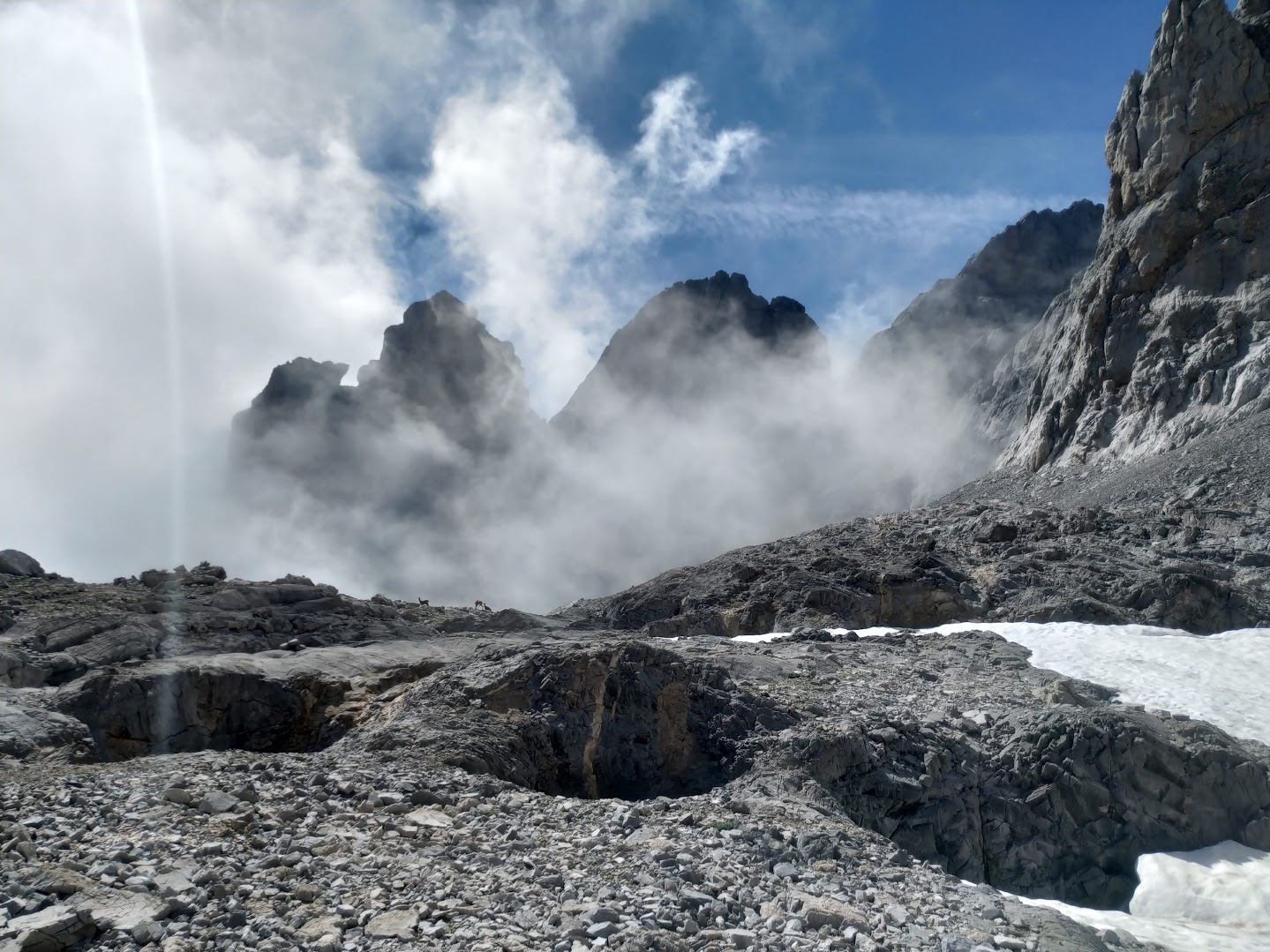 El día ta increyible y el borrín quier xugar coles lluces de la tarde, faciendo'l paisaxe más prestosu si cabe, anque tamién faciéndonos tar sollerte de que nun-y dea por zarrase. Continuaremos conociendo pasos nuevos, ya que la mió anterior ascensión fueera poles marques marielles y agora averámonos hasta'l Tiru Calleh.u, alcontrándonos quiciás col pasu más complexu del día, un trepe de III+ aprosimáu pa salir d'un canalizu per una llambria, anque dicir que ye un pasu finu, nun ye mui espuestu.