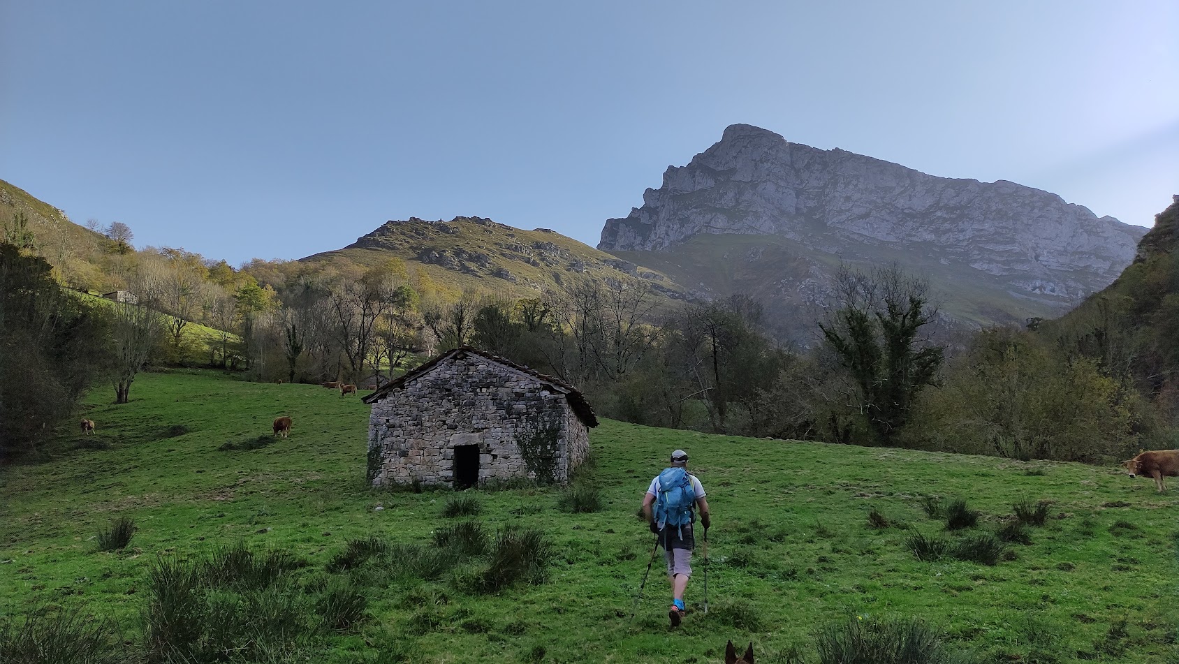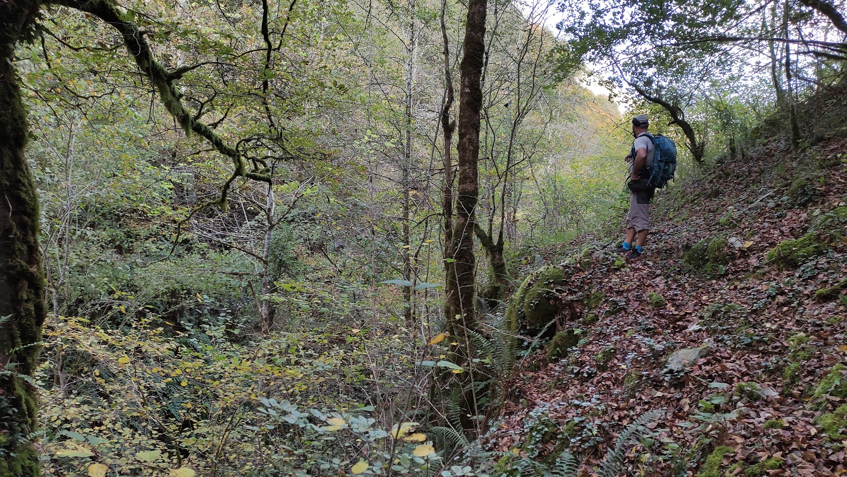 De vuelta nel calce, tendremos un tramu nel que vamos siguiendo traces de sienda, teniéndolo que cruciar en dalgún puntu, hasta aportar a lo que tendríemos por desvíu hacia'l mayáu de Pandiellos, onde alcontramos cláramente un senderu que xubiría pela canal que marcara penriba'l mapa, sorprendiéndome de la vista qu'algamamos col trabayu nos mapas y la esperiencia llueu de campu.