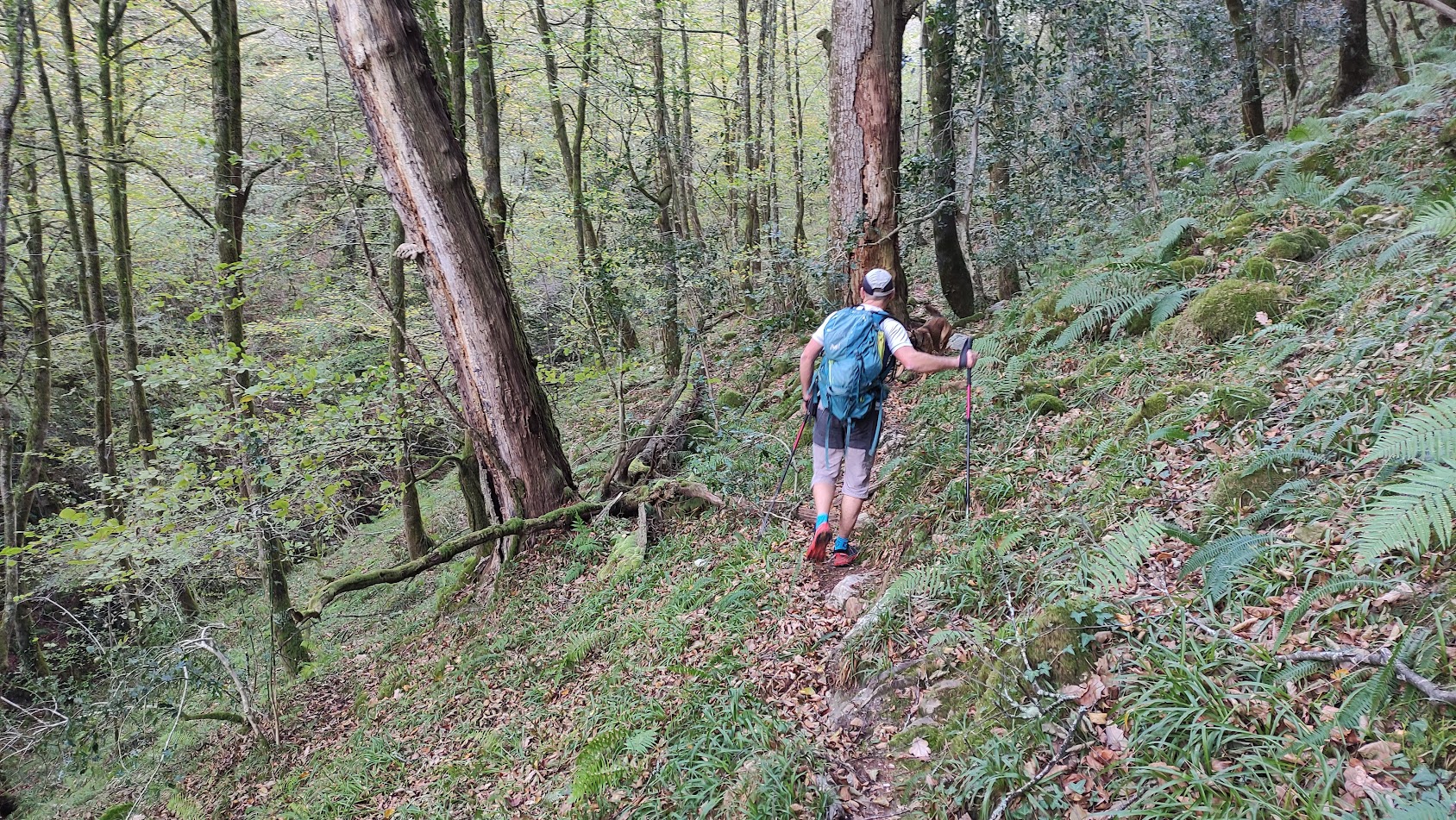 Paez mentira qu'un camín tan grande, rexistráu en tolos mapes, con unes envueltes perfeutes seya imposible de caminar y tengamos que tiranos pela vallina a pinchu, pente los felechos, por suerte secos ya nesta dómina l'añu, algamando la parte baxa del camín, más llimpia al metenos de nuevu nun guapu fayéu, pudiendo caleyar esfrutando d'esti camín hasta Los Pandiellos, onde allúgase un guapu mayáu con cabañes y vida ganadera.
