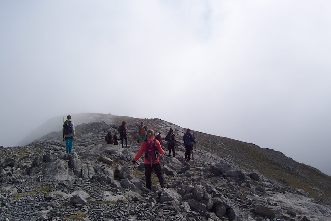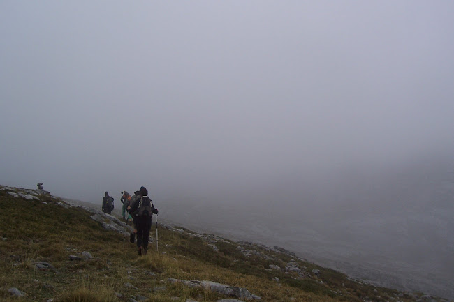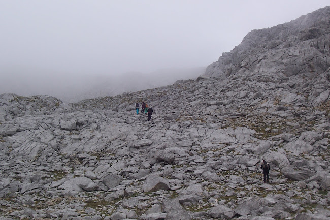 Equí el grupu dixebraráse, pol ritmu d'ascensión y pol borrín que dexó d'esnalar pente nós y acabó por metese en condiciones, faciendo que nun fuéramos nin a venos nunes decenes de metros. Con tranquilidá esperámonos los unos a los otros pa reagrupanos y alcontrámonos toos nel colláu de la Llaguna a 1846 m, faciendo un bon descansu que ya llevábemos 3 hores y media enriba.