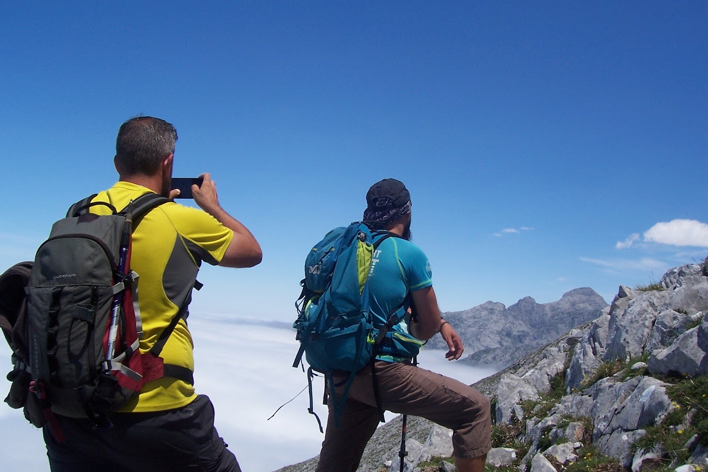 Penriba les ñubes salen montes, como si fueran barcos, destacando'l cercanu Valdepinu, Ten y Pileñes y dellos otros. Demientres, damos la vuelta pa les semeyes y dar aliendu a los más retrasaos, siguimos xubiendo hacia'l senderu que vien de l'ascensión normal dende Peña Beza.