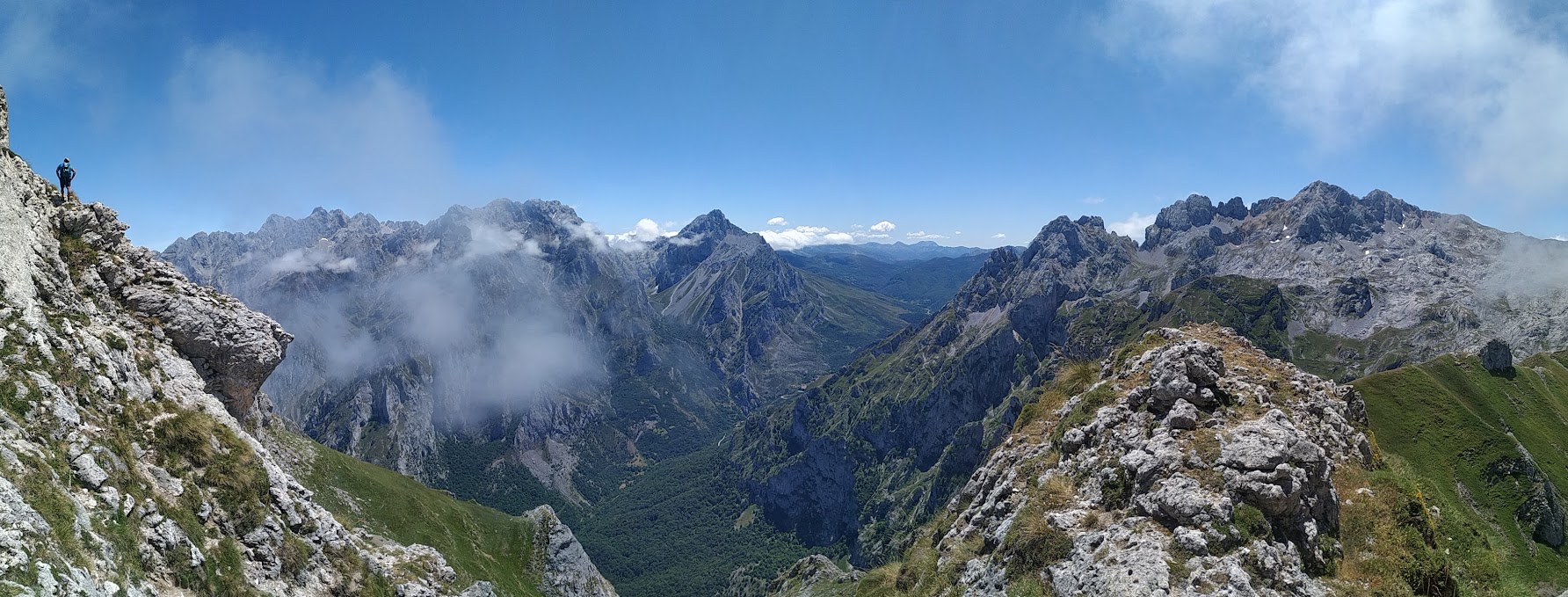 La segunda canalina déxanos ascender mediu caminando per tarrén más cómodu, pero na so parte final, ponse mui vertical con una paredina que paez cortanos el pasu. Nun lo tenemos claro y tovía, faigo una traviesa pisada por robezos onde aparte de les brutales vistes de los Urrieles, alcuéntrome con una tercera canalina mui descompuesta que tamién xubiría a una h.orcadina, anque tampoco paez más cenciello que na que tamos.
