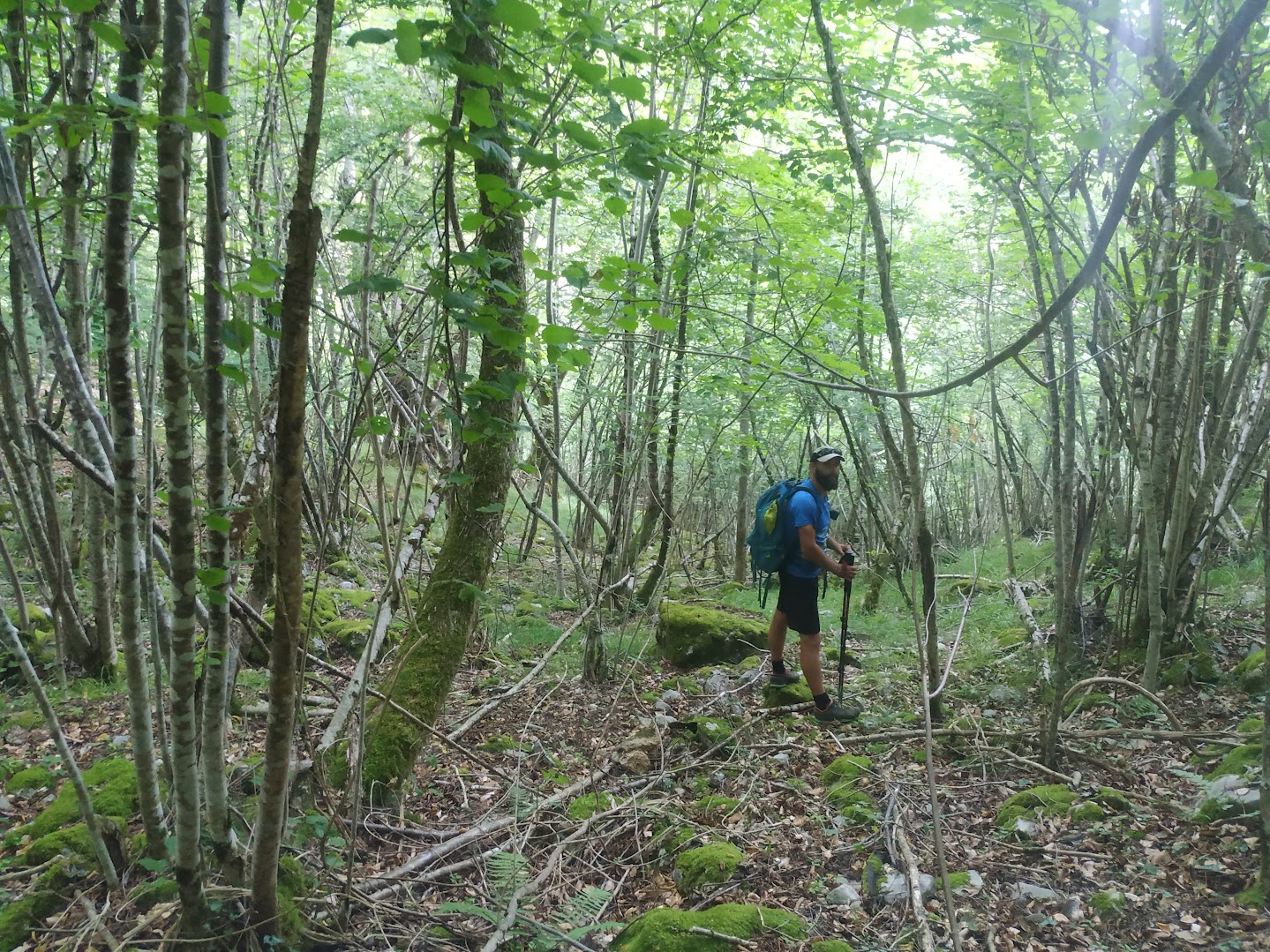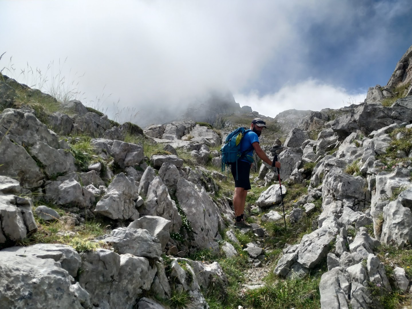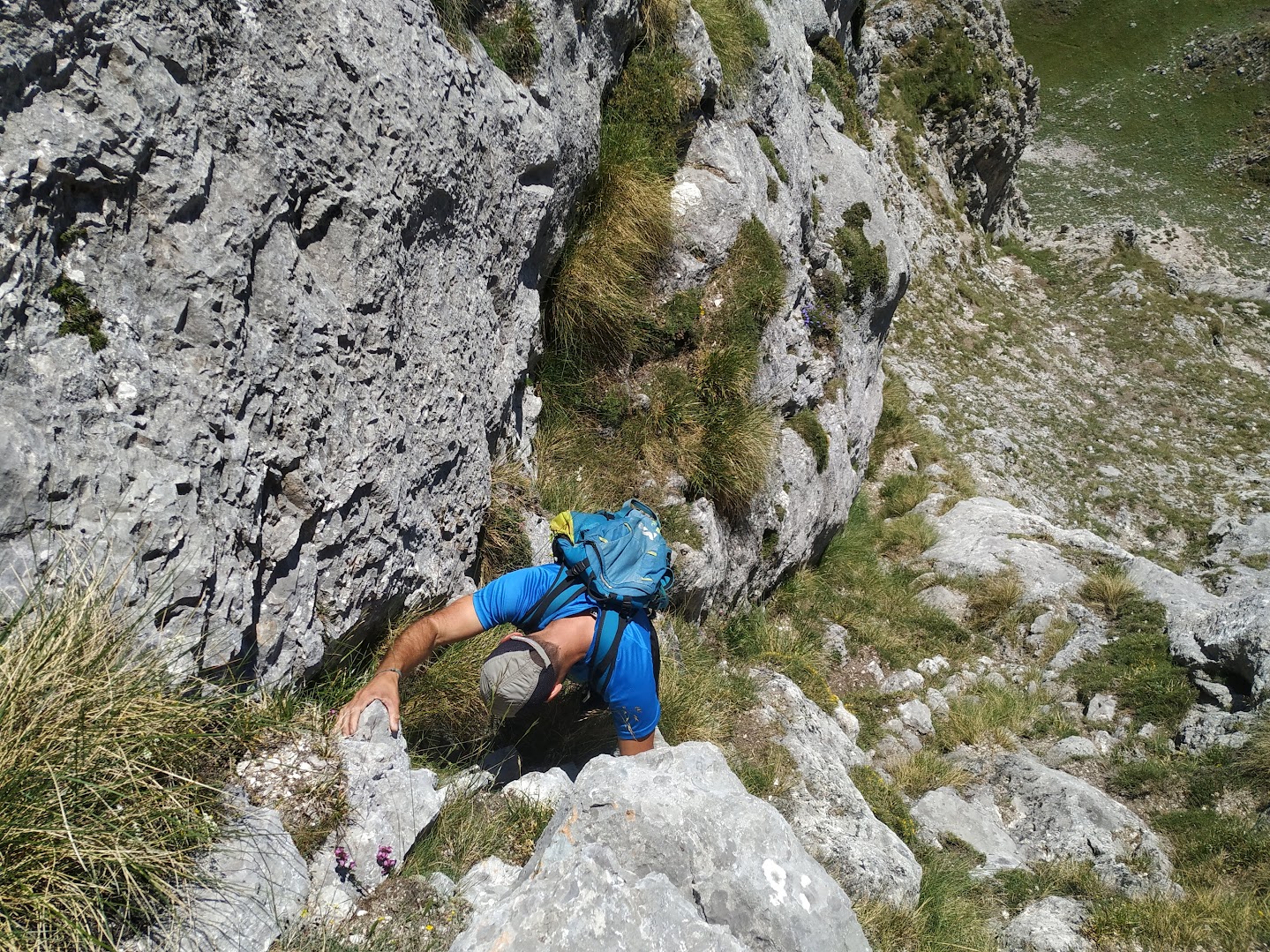 Aportamos fino, fino sin tirar nin una piedra al "pasu" y facemos el destrepe delicáu d'espaldes al vacíu, tocando con mimo cada bloque, evitando lo que se mueve y los pies herbosos o terrosos. Tengo que dicir, que fué de los pasos más malos, poco fiables que fice en trepe y en destrepe, d'esos momentos en monte que nun ties munches ganes de repetir.