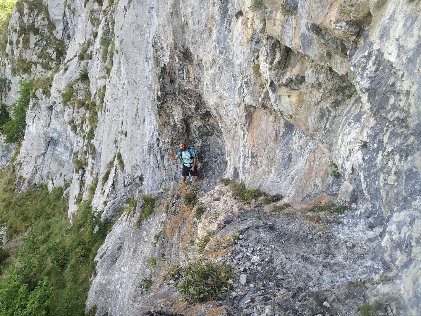 Como referencia, topámonos unes llambries prietes, peles que trepamos aportando a una repisa con vexetación onde alcontramos l'entamu del barrenáu del sedu La García. Nesti puntu, garramos aliendu, ya que nun mos apetez muncho dar media vuelta y entamamos a esfrutar d'un paseín pela vertical, nuna obra xenial pastoril como solo podíen facer les xentes del Cares.