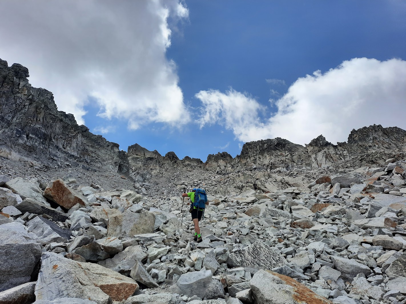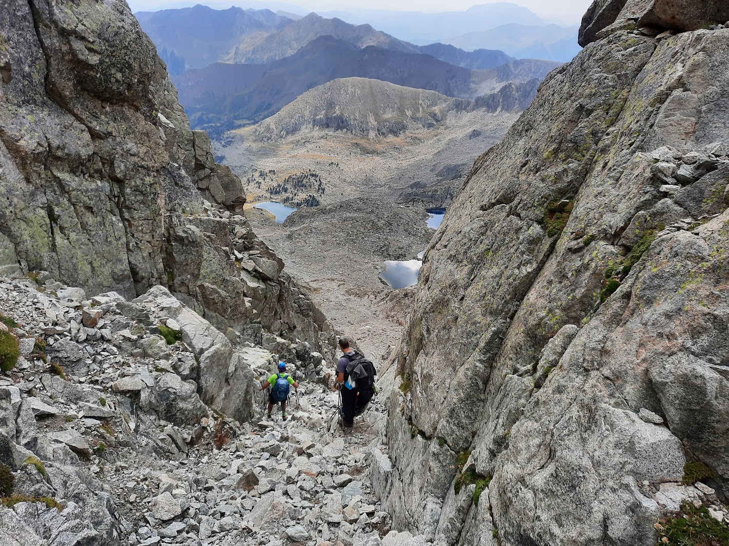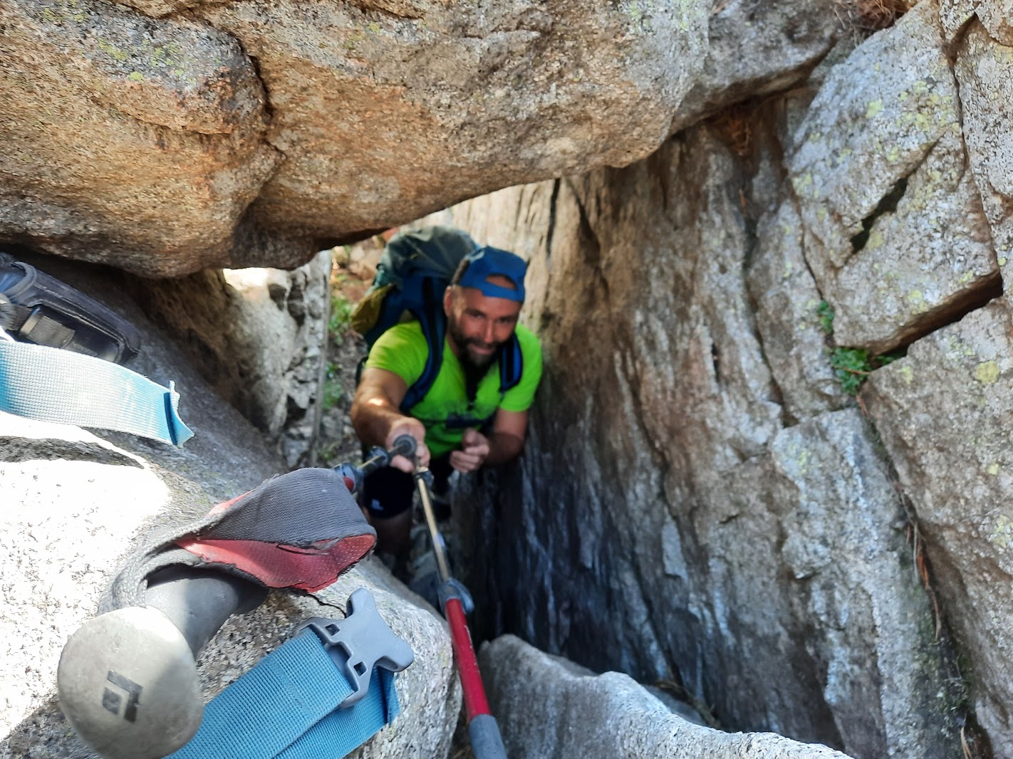 A falta d'unos doscientos metros de desnivel pa l'arista que nos llevaría al cumal, vamos alcontrando xente, viendo a unos mozos baxar per una forcada más averada al Pic y otra pareya que baxa más cerca del Besiberri Sud, los cuales tienen un sustu, zampando un fogón el mozu al que nun-y llevó un morrillu per delantre de milagru.