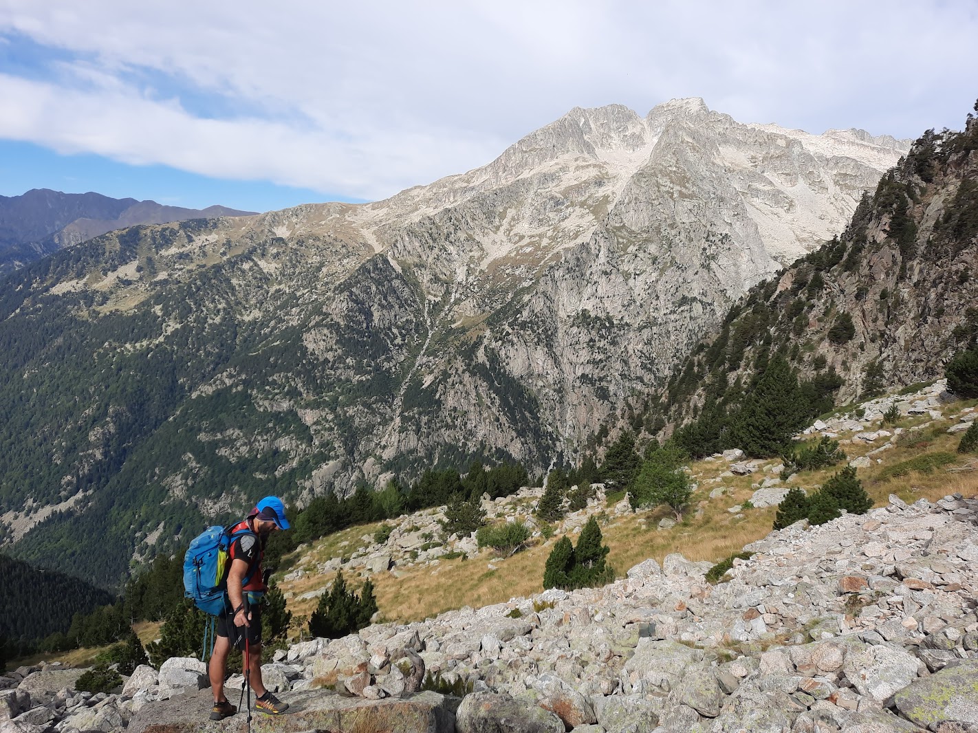 Col merecíu descansu nesti guapu cumal, que ya faise'l nuesu favoritu del viaxe, vamos entamar descensu, primeru per tarrén más complexu hasta dir aselando y desendolcar nun bon camín hacia'l coll d'Arenós, onde ya faise menos pindiu y fadrános empobinar apriesa los nuesos pasos hacia l'Estany de la Roca, otra ablucante llaguna glaciar con guapes vistes hacia'l Pic de Travessani.