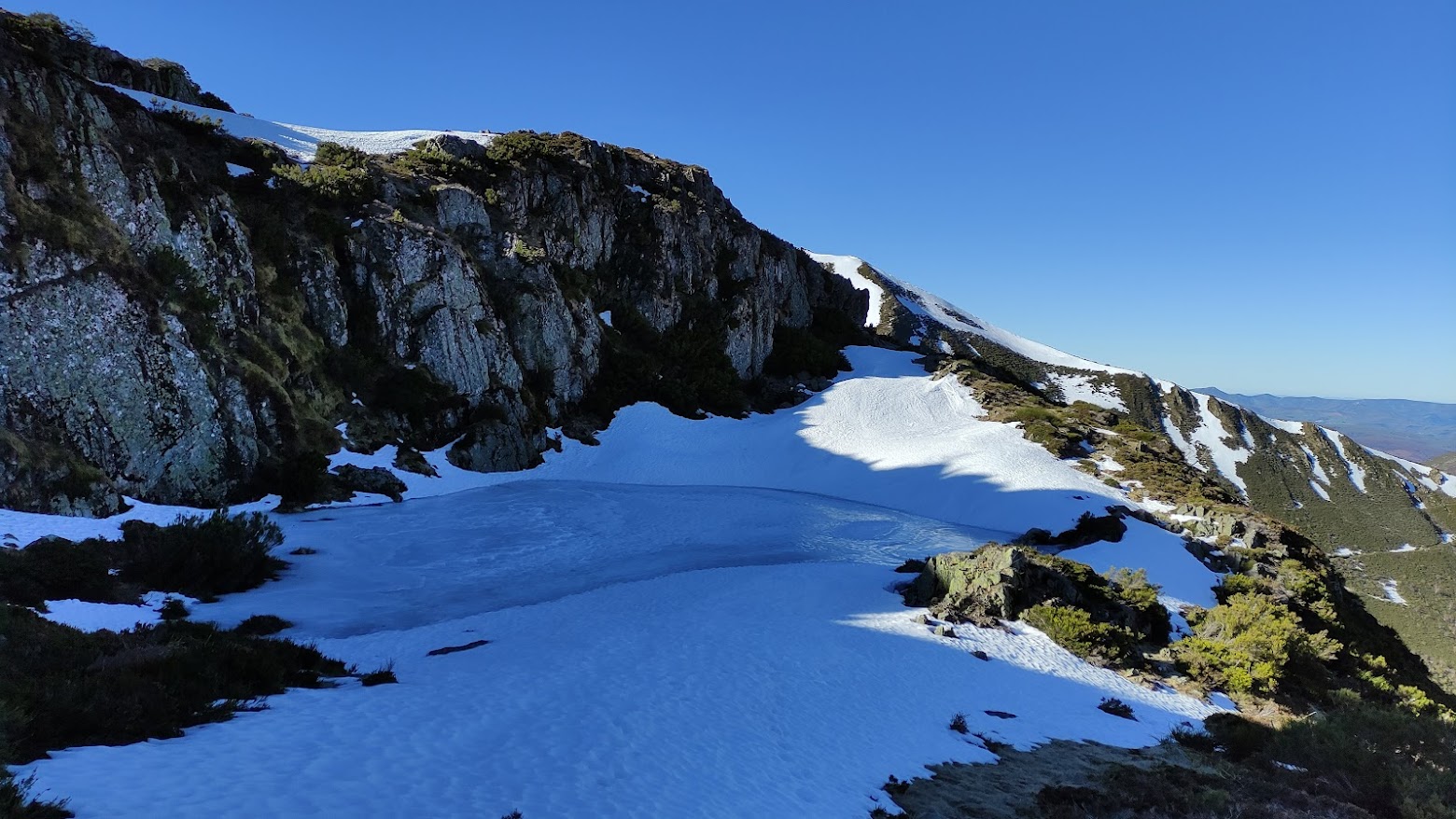 Agora sí, salimos de la fría solombra y recibimos de continuu'l sol nesti Col.láu Tres L.lagunas, atopándoles dafechu xelaes, lo que-y da un puntu más impresionante a un llugar, nel que ya tenemos enfrente, la llínea de montes que separa Cangas del Narcea de Somiedu y a la nuesa mandrecha'l llarguísimu val.le de Oural.lu en L.laciana.