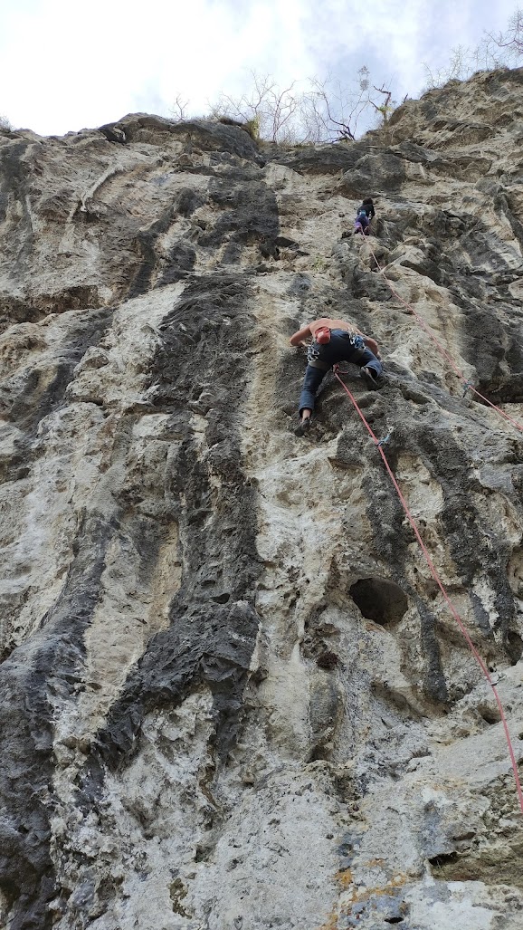 Va tiempu probara un 6c a la mandrecha (Pinta en bastos) que ye un dolor de vía enllena de romos y pasos raros, que pringara porque na parte alta cayérame la intemerata de repente y colamos d'ellí, ensin poder trepar más.